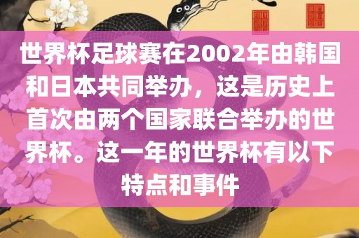 世界杯足球赛在2002年由韩国和日本共同举办,这是历史上首次由两个国家联合举办的世界杯。这一年的世界杯有以下特点和事件