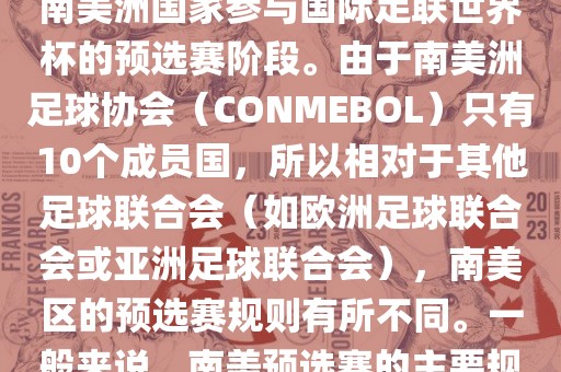 世界杯南美预选赛通常指的是南美洲国家参与国际足联世界杯的预选赛阶段。由于南美洲足球协会(CONMEBOL)只有10个成员国,所以相对于其他足球联合会(如欧洲足球联合会或亚洲足球联合会),南美区的预选赛规则有所不同。一般来说,南美预选赛的主要规则如下