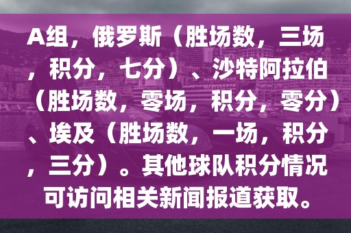 A组,俄罗斯(胜场数,三场,积分,七分)、沙特阿拉伯(胜场数,零场,积分,零分)、埃及(胜场数,一场,积分,三分)。其他球队积分情况可访问相关新闻报道获取。
